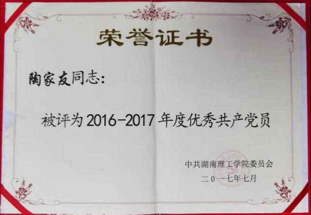 “只有艺术和科学能提高人,直到神圣的高度”。科研能探索未知的世界,满足对自然的好奇心,同时丰富知识,开阔视野,是课堂教学的有益补充和提高。陶家友同志在认真完成日常教学工作的同时,惜时如金,克服重重困难,积极学习专业知识,关注领域科学研究的前沿动态,努力提高自己科研能力和业务水平。1999年本科毕业后,于2006年获得硕士学位,2015年获得博士学位,2017年进入博士后科研流动站。经多年努力,取得了一定的学术成果,获得了国内外同行的认可。其中作为主要成员(第3)参加国家自然科学基金一项(No.11374110);主持湖南省自然科学基金面上项目2项(No.2016JJ2063、2021JJ30298)、湖南省教育厅重点科研项目1项(No.16A086)、服务企业横向项目1项(合同金额50万)。以第一作者/通讯作者发表SCI论文15篇(其中ESI高被引论文2篇,单篇论文被引用200多次)、核心期刊论文7篇,其他排名文章20余篇。成果获湖南省科学技术进步奖三等奖1次,岳阳市自然科学优秀学术论文一等奖1次。
