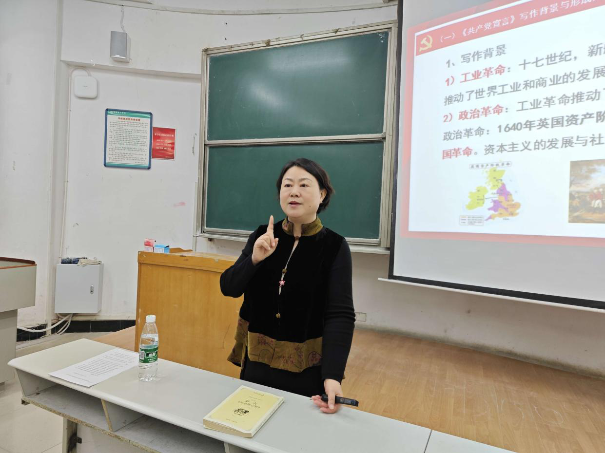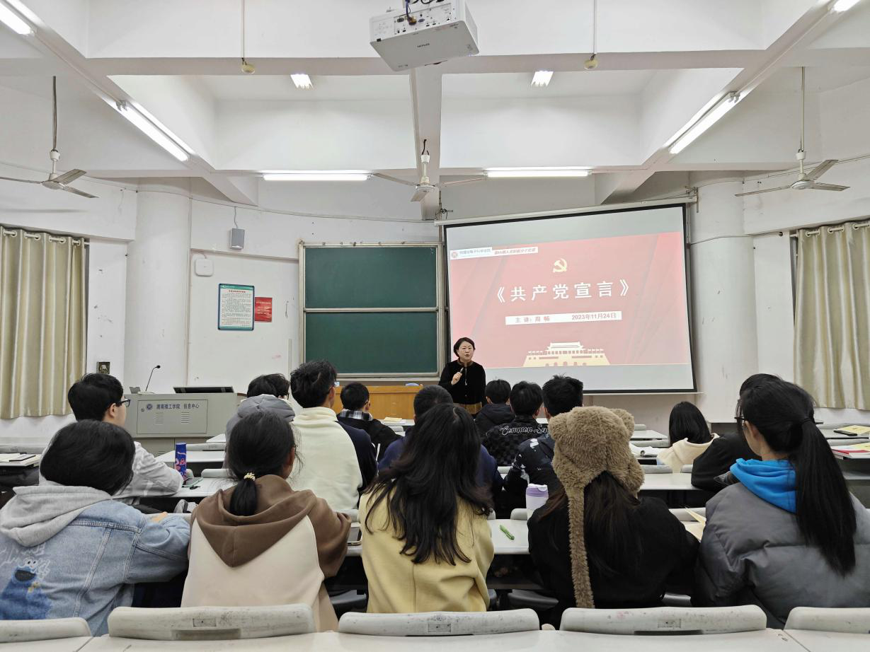 周畅分四个部分讲授。她简要介绍了马克思和恩格斯,并观看视频《不朽的马克思》,同学们了解了青年马克思“为人类而工作”的志向并为之奋斗一生人生选择,马克思和恩格斯伟大的革命友谊,以及他们为国际共产主义运动提供了科学理论指导。周畅对《共产党宣言》的写作背景、形成过程和逻辑结构进行了分析,带领同学们齐声诵读《共产党宣言》的“引子”——“一个幽灵,共产主义的幽灵,在欧洲游荡......”分析了“幽灵”的含义,带领同学们领悟其中蕴含的辩证法思想和唯物史观。分析了中国共产党为什么选择马克思主义作为指导思想和行动指南,说明了“中国共产党为什么能,中国特色社会主义为什么好,归根到底是马克思主义行,是中国化时代化的马克思主义行的深刻道理。最后,她播放电影《1921》中党代表在南湖船上激情表达“全世界无产者,联合起来!”视频结束党课。