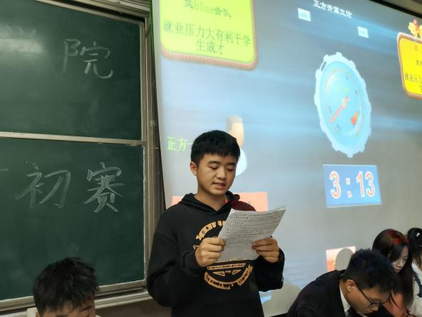 6t1教室共有三组辩论,正方的观点是“人追求梦想应该坚持到底”,反方的观点是“人追求梦想应该量力而行”;6t2教室有两组参赛选手,正方认为“员工就业压力大利于成长”,反方认为“员工就业压力大不利于成长”。辩论赛分为“开篇立论”、“互相提问”、自由辩论“、“总结陈词”、“观众提问”五个环节。在辩论过程中,正方和反方选手运用扎实的专业知识,凭借厚实的文化功底,一针见血提出反驳观点。辩论场面激烈,双方都不甘示弱,辩论过后,经评委小组商议决定,初赛晋级小队是笑blue齿队、微电男团队、你说的不队、微电对对队、你别怼我我怼你队 ,李雷、叶旭东、李文吉、柳镇岳、杜偕申、吴梦涵、徐璐同学在本次辩论中表现优异获得“最佳辩手”称号。