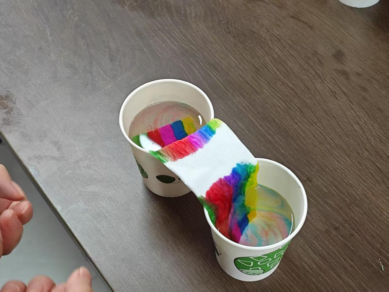 “自制彩虹桥”实验中志愿者们指导小朋友们在有水的杯子里滴入不同颜色的色素,把纸巾一端放进有颜色的水里,另一端放进空杯子。不一会,神奇的事情发生了,空杯子里出现了彩色的水,就像一座美丽的彩虹桥。志愿者向小朋友们讲解了实验原理。