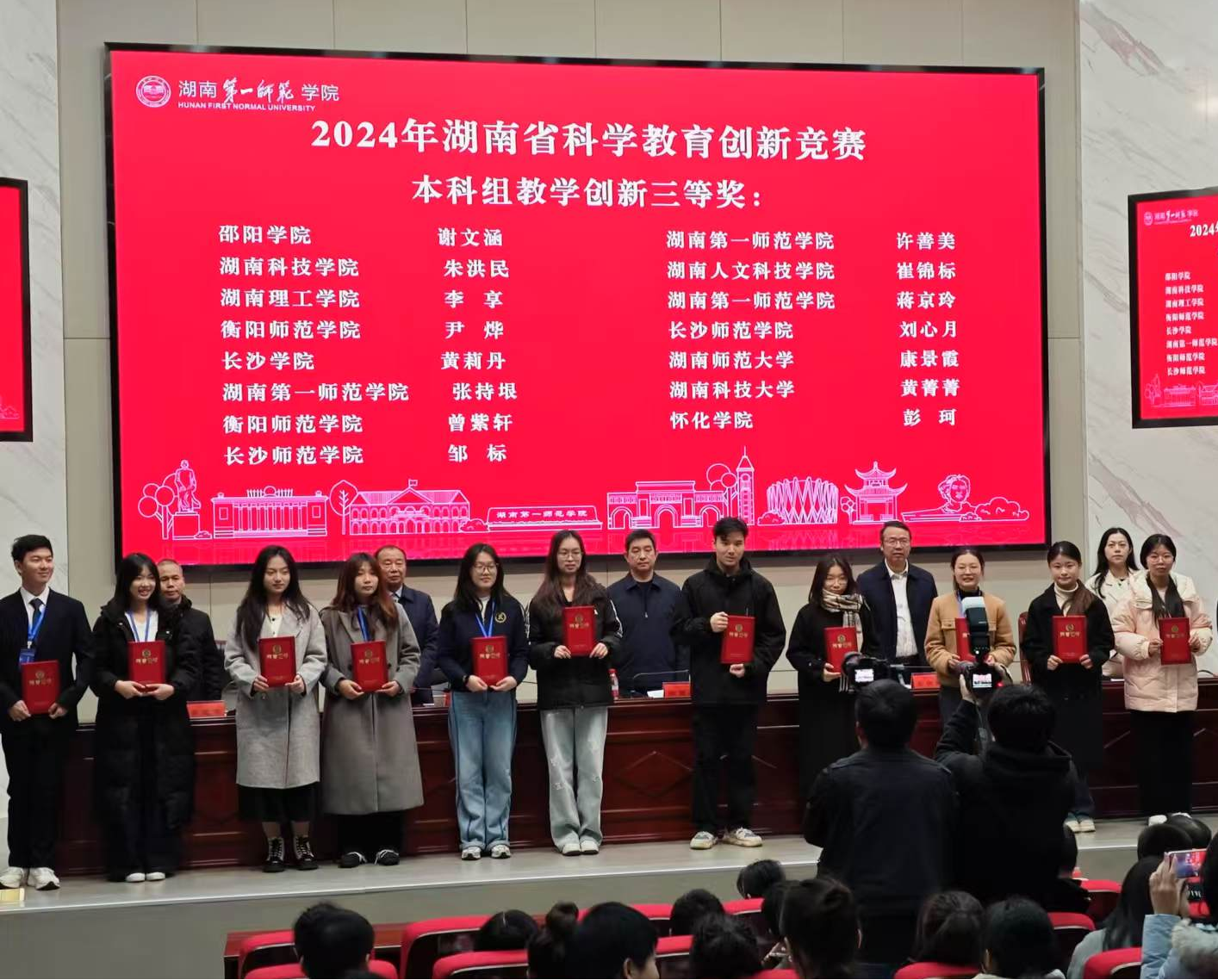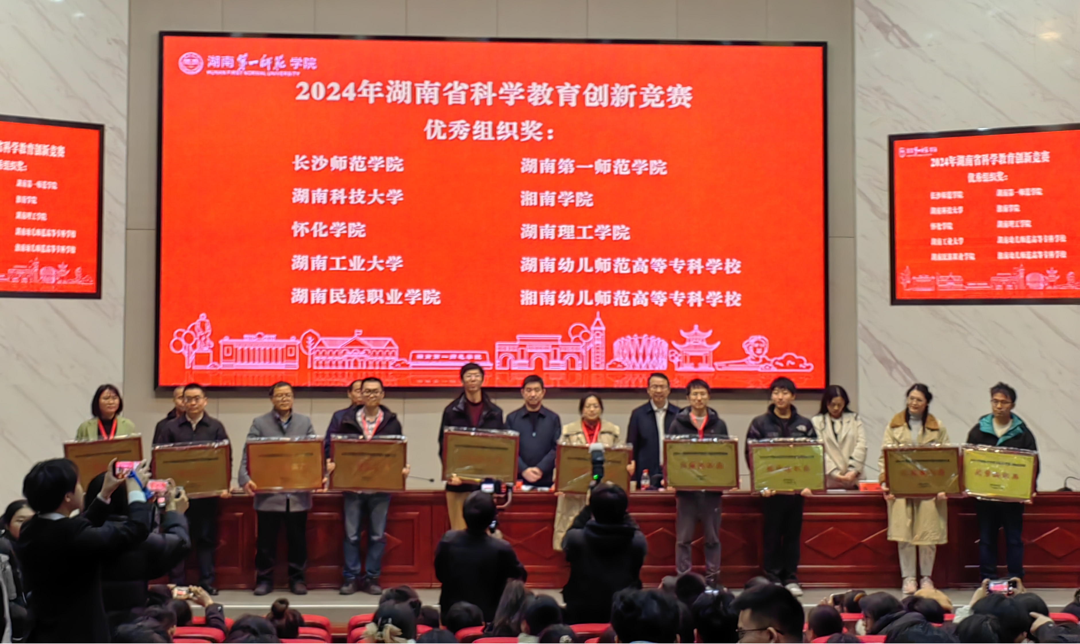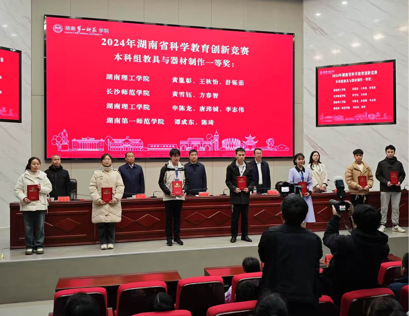 1268日,2024年湖南省高等公司科学教育创新竞赛湖南第一师范公司举行公司在此次竞赛中斩获佳绩,共荣获2个一等奖和1个三等奖,其中黄胤彰、王秋怡、舒铄茹看得见的声音系列教具”,申陈龙、唐玮铖、李志伟尖端放电系列教具”荣获教具与器材制作一等奖,李享同学荣获教学创新三等奖。