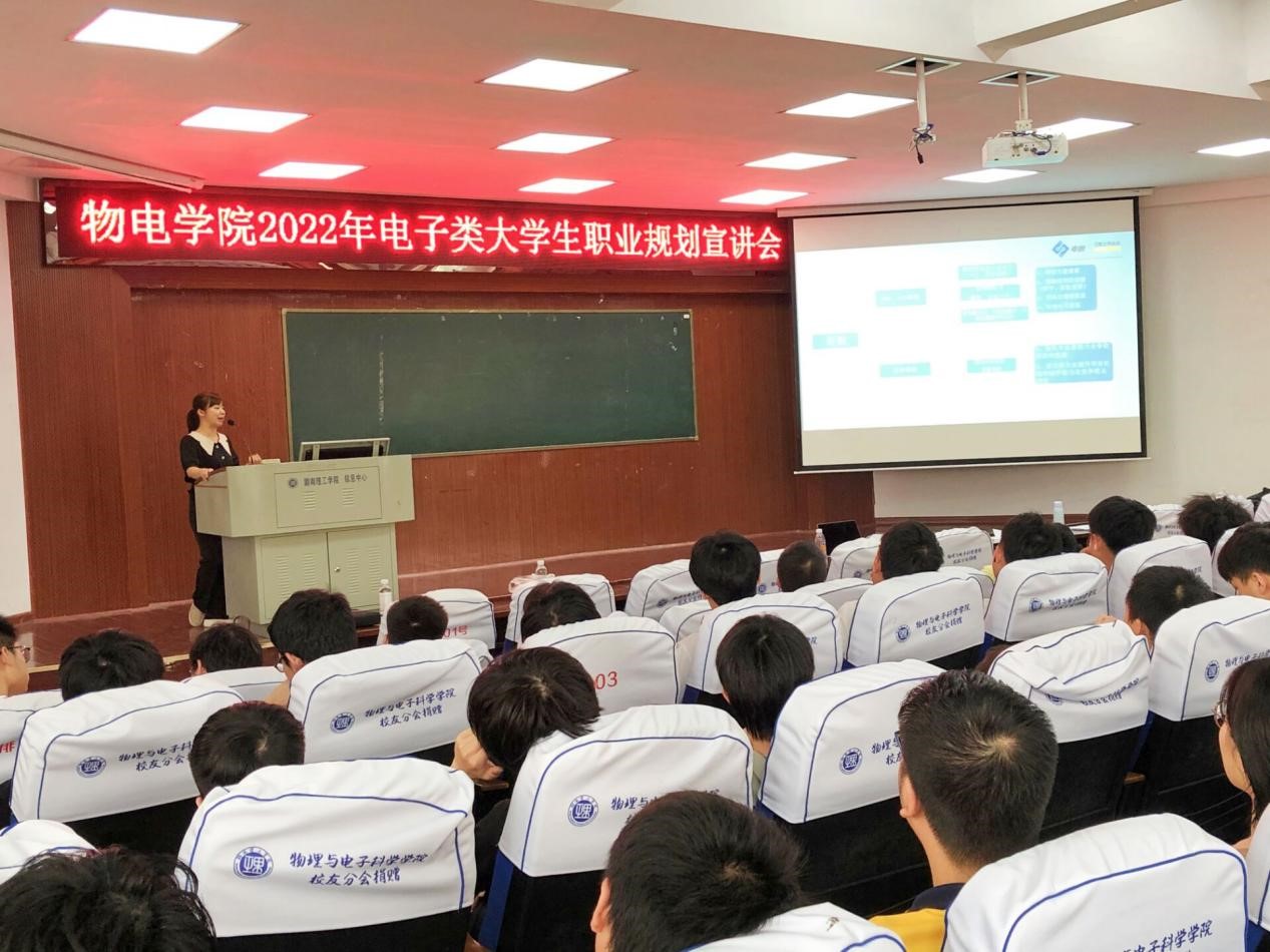 职业规划宣讲会中,面向电子类员工,黄亚对大家进行职业规划和个人发展指导,希望同学们理性面对“就业难”和“考研热”问题,盲目选择的背后并不利于社会前进和个人发展,要以社会需求为导向,勇于到党和国家急需的岗位上发光发热。