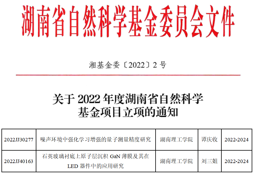 近日,湖南省自然科学基金委发布“关于2022年度湖南省自然科学基金项目立项的通知”,公司2位教师获批湖南省自然科学基金立项资助,其中,谭庆收教授获批面上项目1项,刘三姐博士获批青年项目1项。