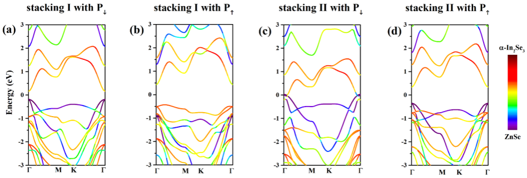 本篇文章研究了二维铁电异质结构α-In2Se3/ZnSe的电子结构。研究发现在α-In2Se3铁电极化的翻转能实现异质结构的带隙从闭合到打开,即金属和半导体的转化,对应逻辑态“0” 和“1”,如图2。而且二维铁电异质结构没有临界效应,在尺寸上远小于传统的钙钛矿结构铁电材料。