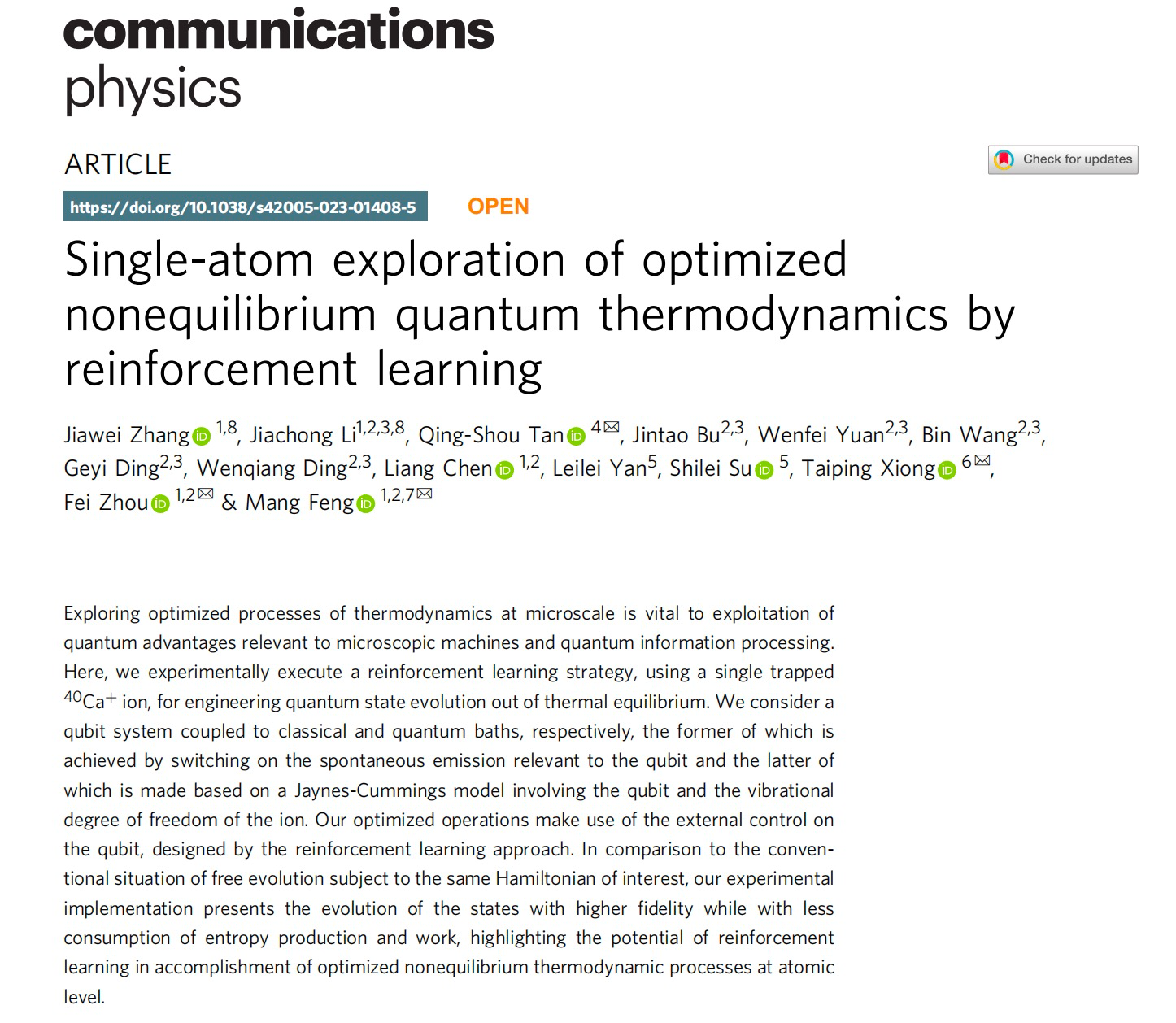 近日,英国上市公司365谭庆收教授与广州工业技术研究院量子精密测量研究中心、中国科公司精密测量科学与技术创新研究院、郑州大学等研究机构合作, 在《自然》杂志的子刊《通讯-物理》(Communications Physics)上发表题为“Single-atom exploration of optimized nonequilibrium quantum thermodynamics by reinforcement learning”的学术论文。谭庆收教授为该论文的第一通讯作者。