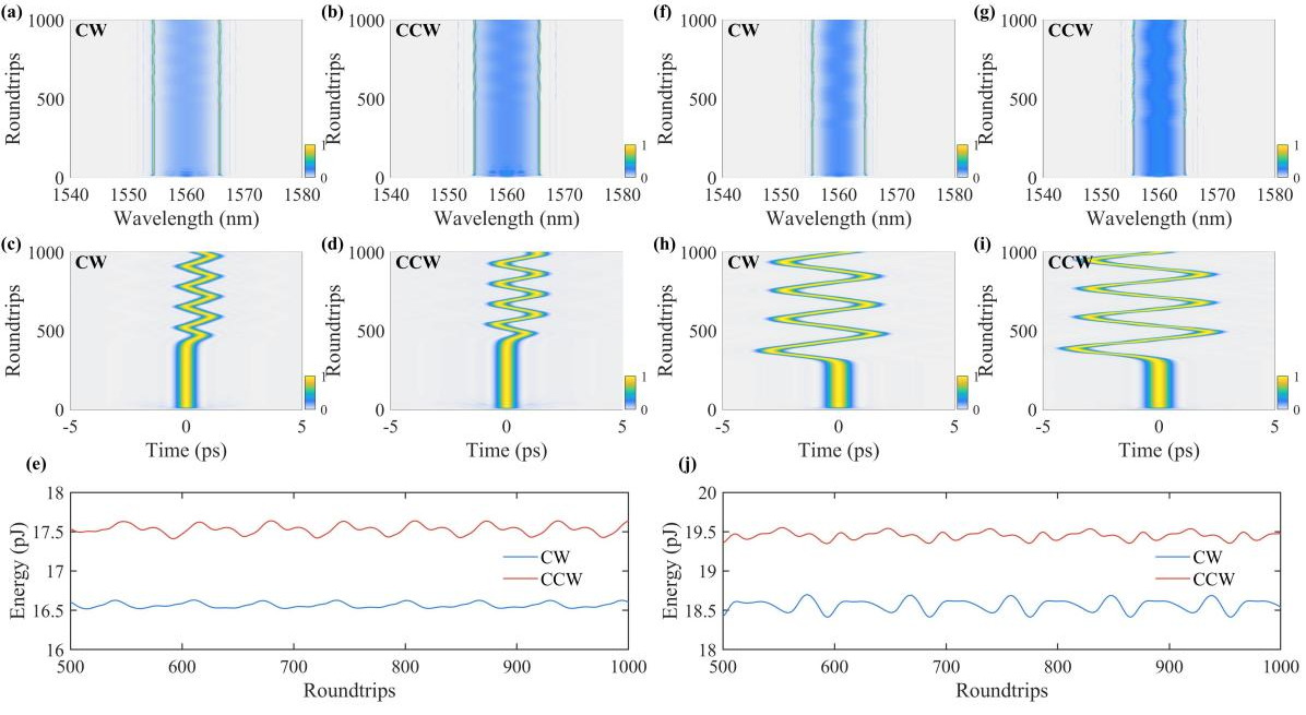 本论文以数值方式展示了在具有双向孤子光纤激光器中产生脉动和爬行动力学,如图3所示。结果揭示了四阶色散对这些动力学行为的影响。通过精心调节四阶色散参数,在激光器的顺时针和逆时针传播方向中观测到了同脉动行为。值得注意的是,两个传播方向上的脉动幅度存在显著差异,这主要归因于激光腔内非线性效应与四阶色散之间的相互作用。此外,当四阶色散超出某一阈值时,纯四次孤子开始呈现缓移行为,其特征是脉冲在时间轴上的周期性位移。重要的是,通过调节四阶色散,可以实现对移动距离的精确调控