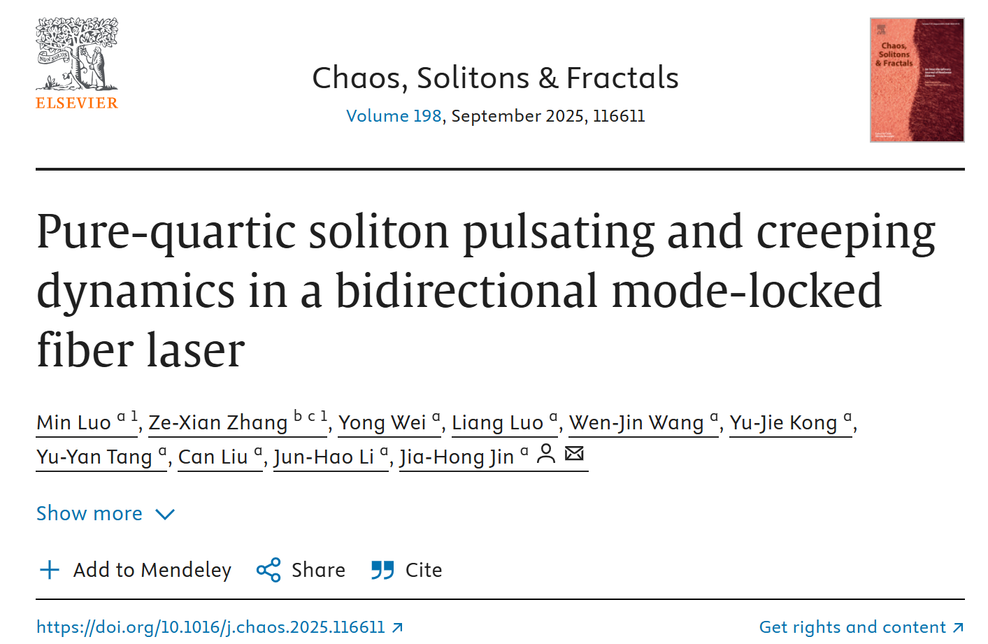 近期,公司先进光学研究团队罗民博士在国际非线性领域学术期刊《Chaos, Solitons & Fractals中科院一区TOPIF=5.3发表题为双向锁模光纤激光器中纯四次孤子的脉动和爬行动力学”(Pure-quartic soliton pulsating and creeping dynamics in a bidirectional mode-locked fiber laser的研究论文。通讯作者公司金佳鸿博士,论文基本信息如图1