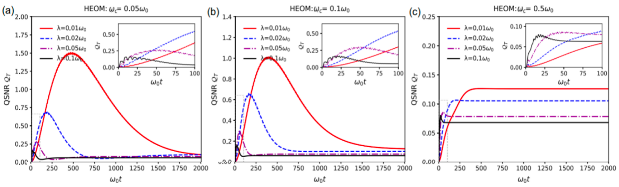 量子测温技术在纳米尺度温度传感、量子计算与生物诊断等领域具有广泛应用,该技术的核心问题之一是如何通过调控探针-环境耦合强度以优化测温性能。团队采用数值精确的级联运动方程(HEOM),突破了传统博恩-马尔科夫近似的局限,实现了全耦合区间量子动力学的精确模拟。研究表明:在非平衡动态测温中,弱耦合可取得更优的量子信噪比;而在稳态测温中,强耦合的优势仅限于极低温区间,在中低温范围内,弱耦合反而更具精度优势。