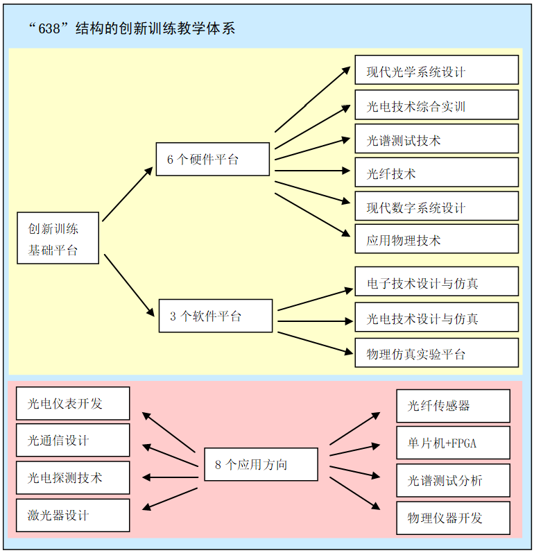 本中心根据社会和企业对人才需求的特点,结合光电技术与应用物理创新中心现有的基础和成果,构建了以“638”(6个硬件平台、3软件平台、8应用方向)结构为核心的创新训练教学体系。“638”结构的训练体系具备光电技术及应用物理中的必须软硬件基础,并通过8个方向的相互独立但又内在关联的柔性模块,涵盖了建模和软硬件设计各方面的可能训练内容,通过将两个或几个方向组合,还可以构成新的训练项目。