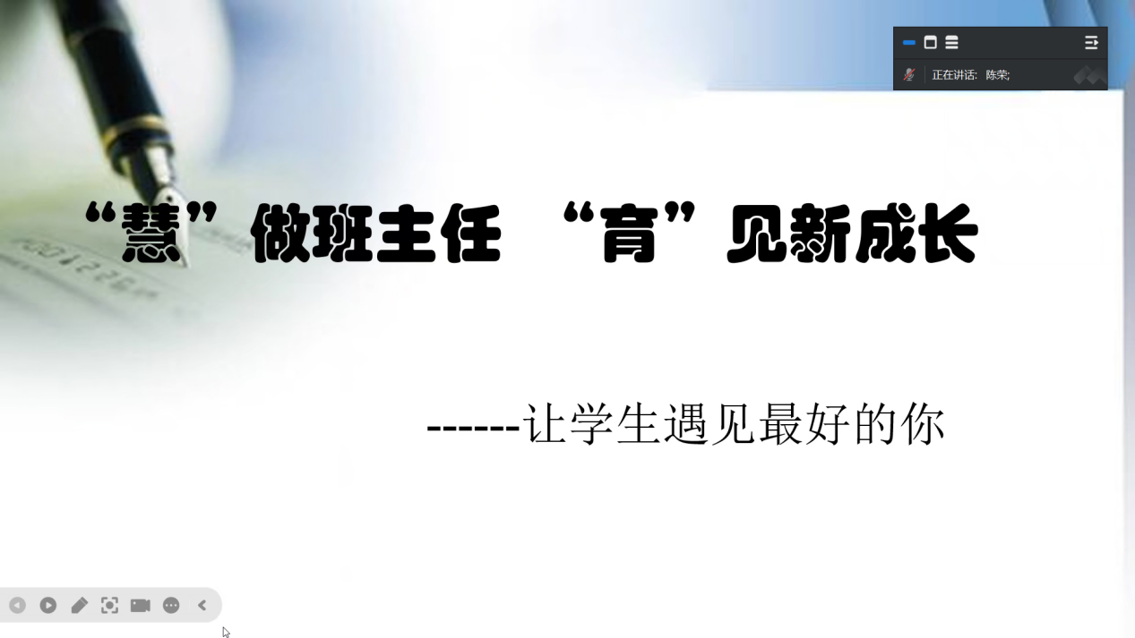 公司优秀员工、岳阳市优秀教师、岳阳市二中董事长陈荣以“‘慧’做班主任 ‘育’见新成长”为题,结合自身的经历和经验,阐述了班主任的工作任务、原则和方法、应该具备的素质,她认为班主任必须有五心,即责任心、宽容心、公平心、爱心和细心。