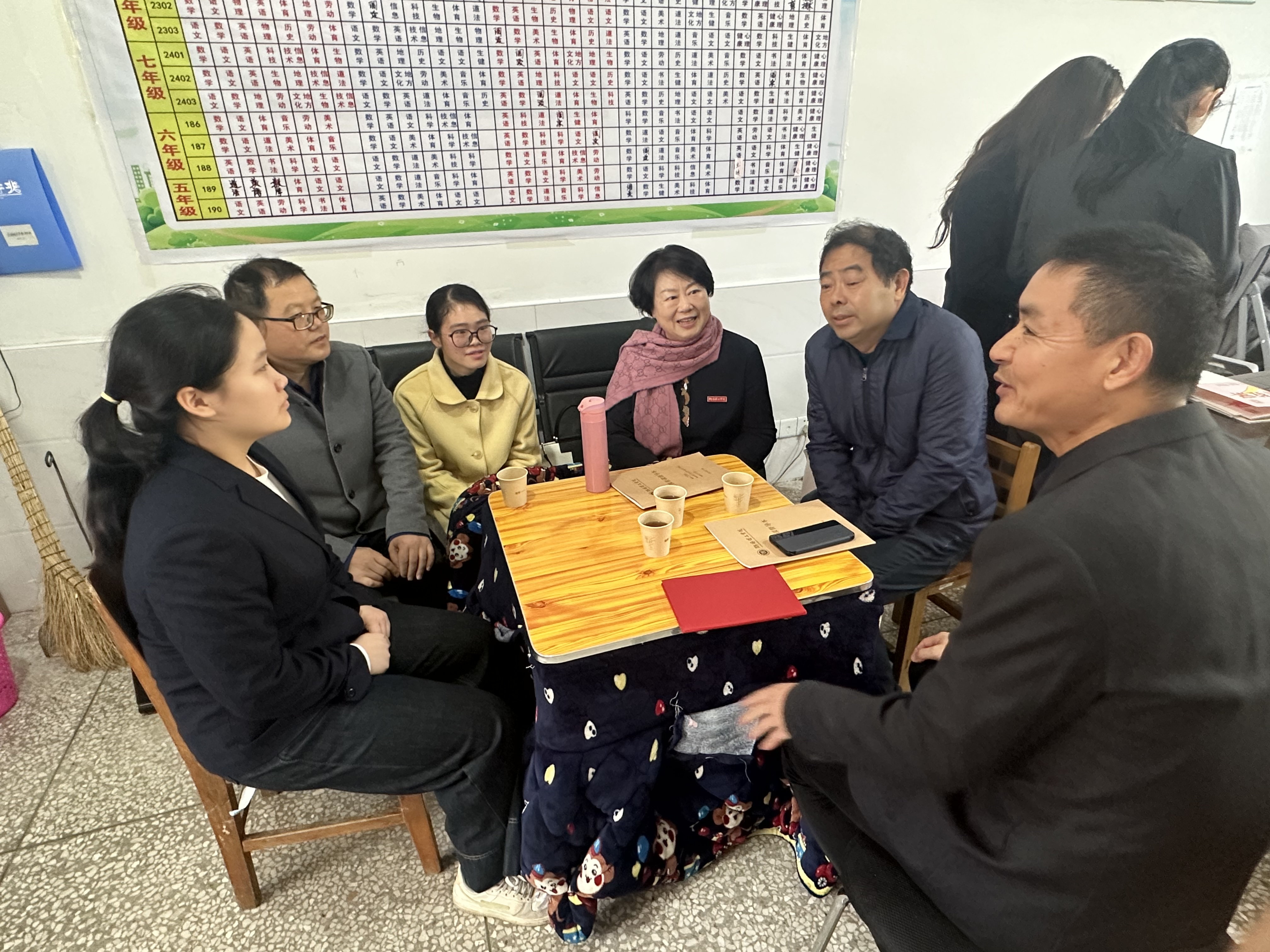 周畅一行向长塘中学董事长(右一)了解实习生冯雨晴(左三)、毕业生钟琼的情况