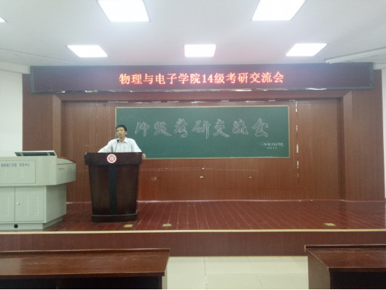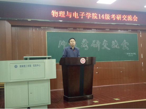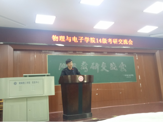 4位13级考研成功的同学结合自己的考研经历跟同学们进行经验交流。考上湘潭大学的周强同学表示考研并不难。他利用暑假的时间,强化自己的知识,形成知识网络。不浮躁,坚持下去,朝着自己的目标努力。越到后面越要坚定,不要因为小事而改变决心。魏莎莉考上了湖南大学的研究生。她给了大家几点建议:物理建模,物理竞赛的奖很重要,这些奖证明了你的能力;选定一个考研老师就跟到底,不要被其他同学影响;有时间就多待自习室学习,巩固自己的知识。刘永峰在老师和学长学姐的帮助下,带着自信和坚持,考上了西南交大的研究生。他说复习时要找好战友,找好团队,抓紧一切时间复习,不浪费一分一秒。袁伟男,一个成绩差,班级排名倒数的同学通过自己的努力,逆袭考上了暨南大学。对于考研的心态,他认为一颗平常心尤为重要,在复习中要避免受到他人干扰。在学习上要有计划性,目的性,战略性,学会梳理归纳知识点。13级考研成功的同学的倾囊讲述博得了在场同学的阵阵掌声。